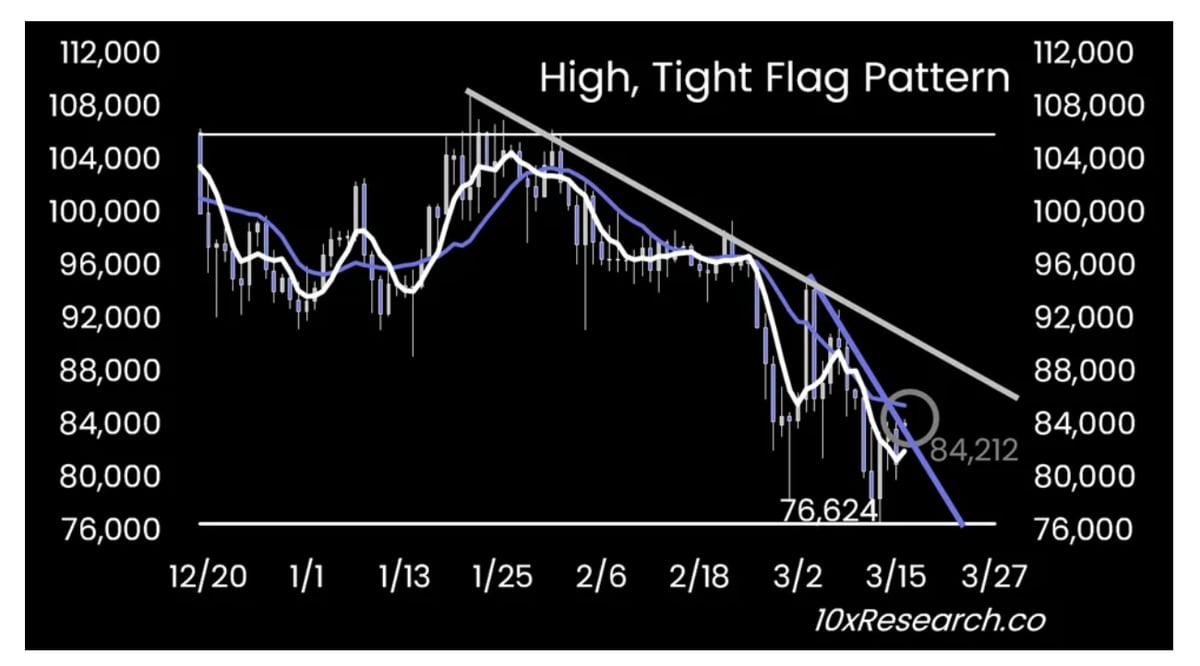 틸렌은 비트코인의 현재 차트가 '하이 앤 타이트 플래그(High and Tight Flag)' 형태를 띠고 있다고 분석했다. 이 패턴은 일반적으로 상승세 지속을 의미하지만, 그는 "정확한 단일 패턴 대신 두 개의 깃발 형태가 형성돼 있어 패턴의 강도가 약해졌다"고 평가했다. 이어 "현재 이 차트는 단순한 강세 조정보다는 시장의 불확실성을 나타낸다"고 설명했다.