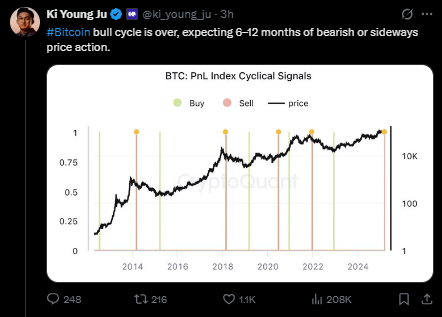 강세장의 종료를 선언한 크립토퀀트 주기영 CEO (출처: @ki_young_ju, X)