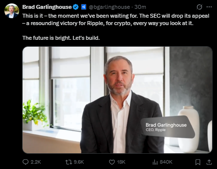 리플의 CEO 브래드 갈링하우스는 X를 통해 "SEC가 항소를 철회했다. 이는 리플뿐만 아니라 암호화폐 산업 전체의 승리이며, 앞으로 더 밝은 미래를 만들어갈 것"이라고 밝혔다.
