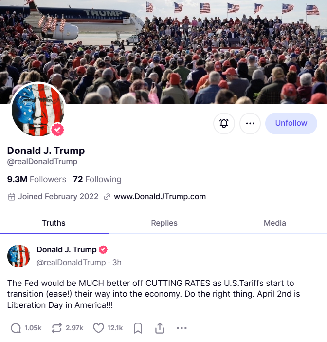 연준의 금리 인하를 압박하는 트럼프 대통령 (출처: Truth Social)