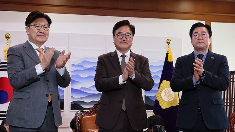 국민의힘 권성동 원내대표(왼쪽), 우원식 국회의장(가운데), 더불어민주당 박찬대 원내대표(오른쪽) (출처: 연합뉴스)