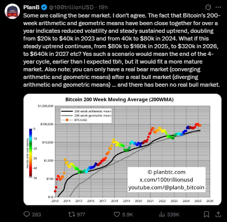 플랜비는 19일(현지시간) X를 통해 “기하평균과 산술평균을 고려할 때, 아직 강세장이 시작되지 않았다. 강세장이 오지 않았기 때문에 진정한 약세장도 없다고 볼 수 있다”고 밝혔다.