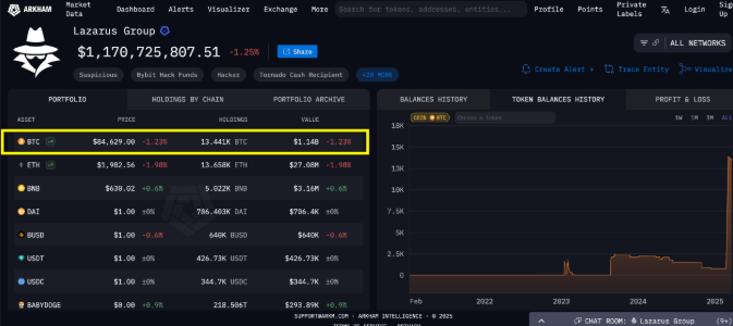 암호화폐 정보 분석업체 아캄 인텔리전스(Arkham Intelligence)에 따르면, 라자루스 그룹은 현재 약 13,441개의 비트코인(BTC)을 보유 중이며, 이는 약 11억 4,000만 달러 규모다. 이는 테슬라의 보유량인 11,509 BTC보다 약 16% 많은 수치다.