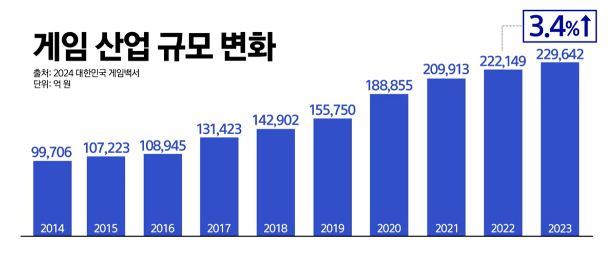 한국콘텐츠진흥원에 따르면, 2023년 국내 게임산업 규모는 22조 9,642억 원으로 집계됐다. 이는 전년 대비 3.4% 증가한 수치로, 국내 커피 산업 규모(약 17조 원)를 훌쩍 넘어선다.