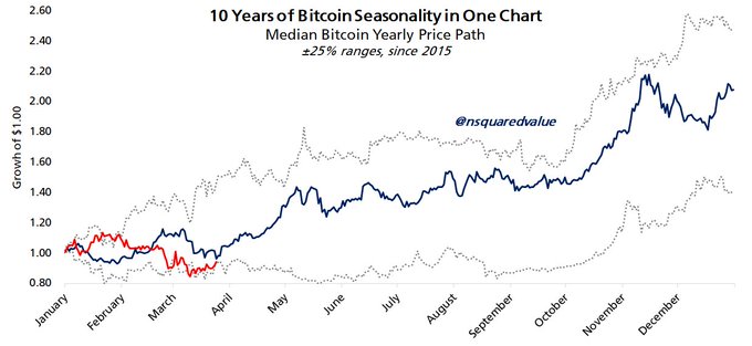10년간 시즌별 비트코인 가격 흐름 차트 (출처: @nsquaredvalue, X)