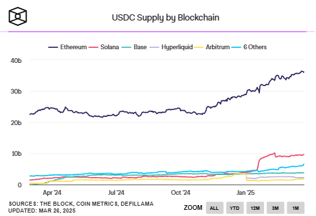 USDC는 이더리움 블록체인에 가장 많이 배포돼 있으며, 약 360억 달러 이상이 이더리움 상에 존재한다. 그 뒤를 이어 솔라나(100억 달러), 베이스(38억 달러), 하이퍼리퀴드(22억 달러), 아비트럼(18억 달러), 베라체인(10억 달러) 등으로 분산되어 있다.
