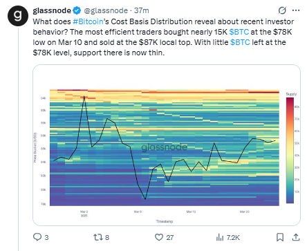 온체인 데이터 분석업체 글래스노드는 28일 X를 통해 “지난 10일 동안 비트코인 트레이더들이 7.8만 달러 부근에서 약 1만5000 BTC를 매수한 뒤, 8.7만 달러 부근에서 매도했다”고 밝혔다. 이에 따라 7.8만 달러 구간은 단기적인 매수세가 이미 소진된 상태로, 강한 지지선 역할을 기대하긴 어렵다는 설명이다.