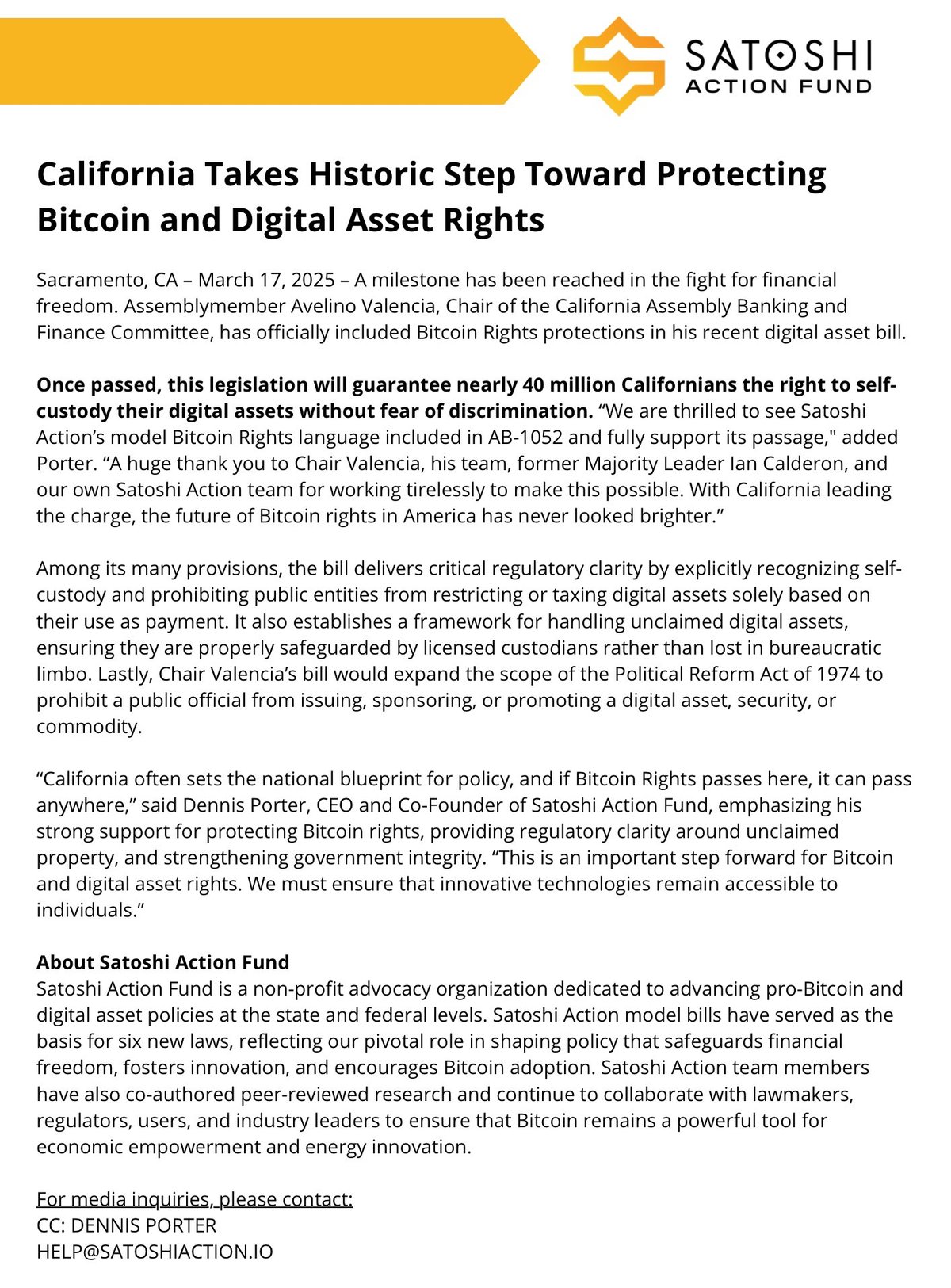 발렌시아 의원이 발의한 '비트코인 권리' 법안 AB-1052에 대해 소개 (출처: @SatoshiActFund, X)