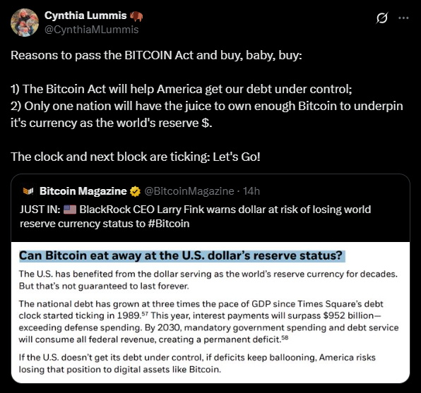 정부 차원에서 비트코인 매집을 해야 할 이유를 게시한 신시아 루미스 상원의원 (출처: @CynthiaMLummis, X)