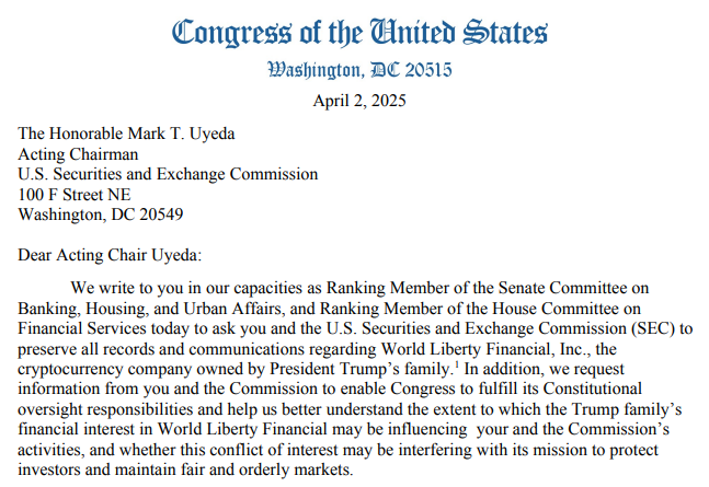 4월 2일(현지시간), 상원 은행위원회의 엘리자베스 워런 의원과 하원 금융서비스위원회의 맥신 워터스 의원은 SEC 임시 의장 마크 우예다에게 서한을 보내, 트럼프 일가와 암호화폐 기업 월드리버티파이낸셜(World Liberty Financial, WLFI) 간의 관계와 관련된 정보를 의회에 제출하라고 촉구했다. 두 의원은 이 기업이 SEC의 독립성과 공정성에 영향을 줄 수 있다고 지적하며, 투자자 보호와 시장 질서를 책임지는 기관으로서의 SEC 기능이 훼손될 수 있다고 경고했다.