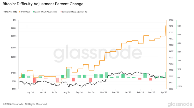 비트코인 채굴 네트워크의 연산력은 최근 채굴 난이도 조정과 맞물려 더욱 주목받고 있다. 약 7%의 상승폭을 기록한 이번 난이도 조정은 2024년 7월 이후 최대치로, 최근 17번의 조정 중 14번이 난이도 상승으로 이어졌다. 현재 기준 채굴 난이도는 121.5조(T)에 이르며, 이는 역대 최고 수준이다.