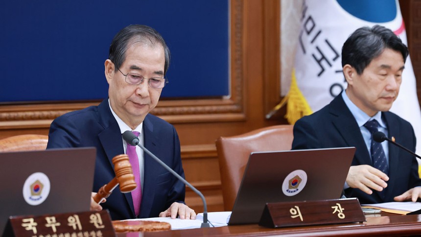 8일 정부서울청사에서 열린 국무회의에서 의사봉을 두드리며 개회 선언을 하는 한덕수 대통령 권한대행 국무총리 (출처: 연합뉴스)