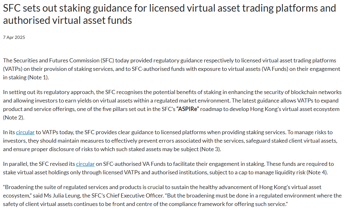 홍콩 SFC가 발표한 스테이킹 서비스 규제 지침 (출처: SFC)