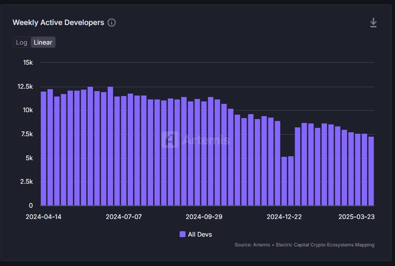 암호화폐 데이터 플랫폼 아르테미스 터미널에 따르면, 오픈소스 저장소에서 활동하는 주간 개발자 수는 2024년 3월 17일 기준 1만2,380명에서 2025년 3월 16일 기준 7,600명 수준으로 줄었다. 38.6%에 달하는 감소폭은 암호화폐 업계 전반의 기술 기반이 약화되고 있음을 보여준다.