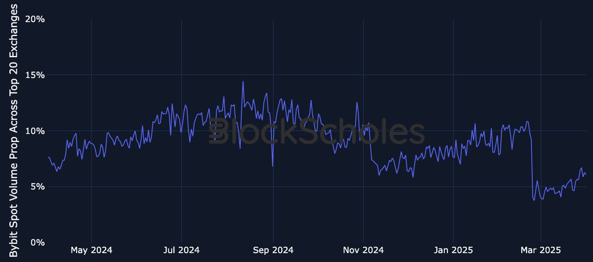 암호화폐 분석업체 블록스콜스(Block Scholes)는 4월 9일 발표한 보고서에서 “해킹 이후 한동안 거래량이 줄어들며 점유율도 크게 낮아졌지만, 최근 들어 다시 상승세를 보이고 있다”며 “투자자 심리가 회복되고 거래량이 돌아오면서 바이비트의 점유율이 안정적으로 반등 중”이라고 밝혔다.