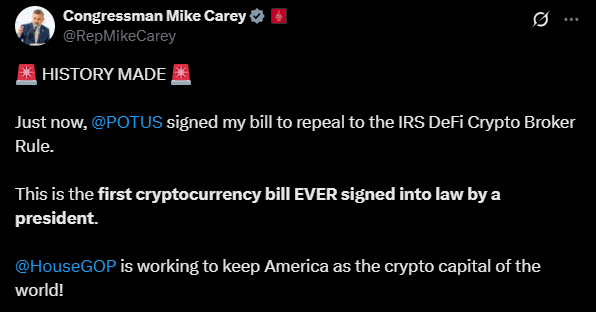 트럼프 대통령의 디파이 과세 규정 폐지 서명을 알리는 마이크 캐리 의원 (출처: @RepMikeCarey, X)