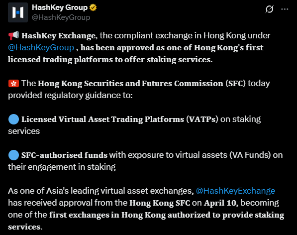 홍콩 SFC로부터 정식 스테이킹 서비스 제공 승인을 받은 해시키 거래소 (출처: HashKeyGroup, X)