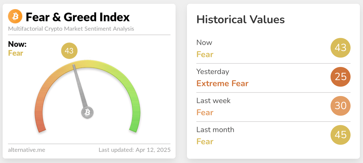 암호화폐 데이터 제공 업체 알티너티브(Alternative)에 따르면, 공포·탐욕 지수는 전날보다 18포인트 상승하며 43을 기록했다. 이 지수는 0에 가까울수록 투자자들이 극단적인 공포를 느끼고 있으며, 100에 가까울수록 시장이 과열되었음을 나타낸다.