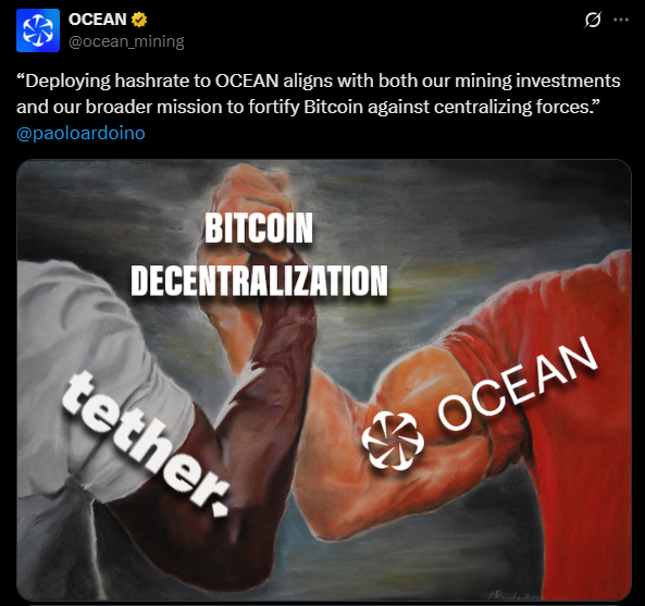 테더와 협력하는 오션 (출처: @ocean_mining, X)