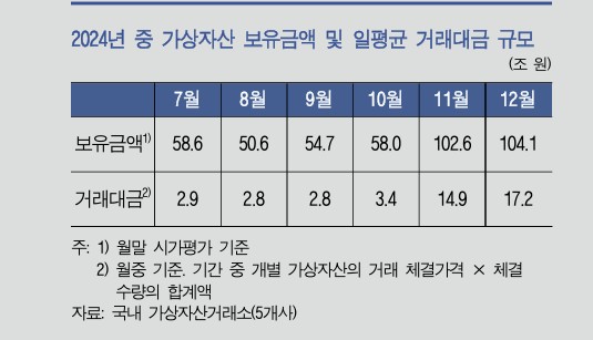 한국은행이 21일 발표한 ‘2024년도 지급결제보고서’에 따르면, 작년 12월 말 기준 국내 주요 암호화폐 거래소 5곳의 보유 암호화폐 시가 총액은 104조1000억 원에 달했다. 이는 불과 몇 달 전인 7월부터 10월까지 50조 원대에 머물던 수준에서 두 배 가까이 늘어난 수치다. 특히 트럼프 대통령 당선 직후인 11월에만 102조6000억 원으로 급등하며 분위기가 반전됐다.