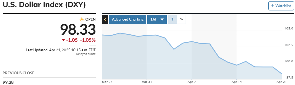 달러화의 국제적 위상이 흔들리고 있다. 21일 달러인덱스(DXY)는 전일 대비 1.3% 하락한 98.112를 기록했다. 이는 2022년 3월 이후 약 3년 만에 가장 낮은 수치다. 달러인덱스는 유로, 엔, 파운드 등 주요 6개국 통화 대비 미국 달러의 상대 가치를 반영하는 지표다.