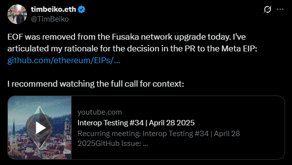 푸사카 업그레이드에서 EOF가 제거 되었다고 알리는 팀 베이코 (출처: @TimBeiko, X)