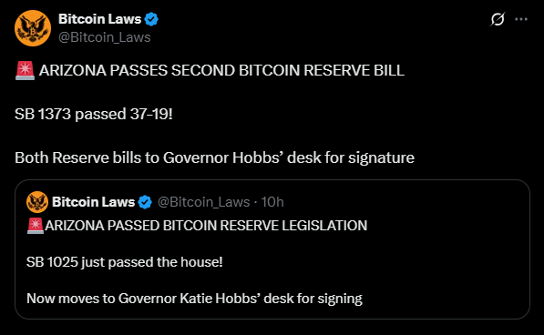 비트코인 투자 법안이 하원 본회의를 통과 후, 주지사의 서명을 기다리고 있다. (출처: @Bitcoin_Laws, X)