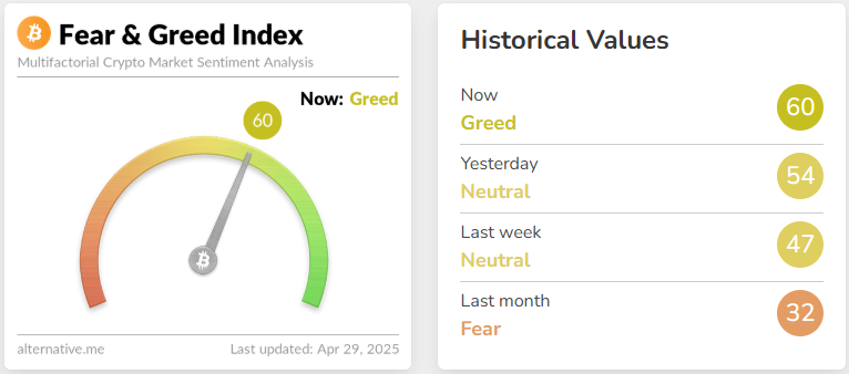 암호화폐 데이터 제공 업체 알티너티브(Alternative)에 따르면, 공포·탐욕 지수는 전날보다 6포인트 상승하며 60을 기록했다. 이 지수는 0에 가까울수록 투자자들이 극단적인 공포를 느끼고 있으며, 100에 가까울수록 시장이 과열되었음을 나타낸다.