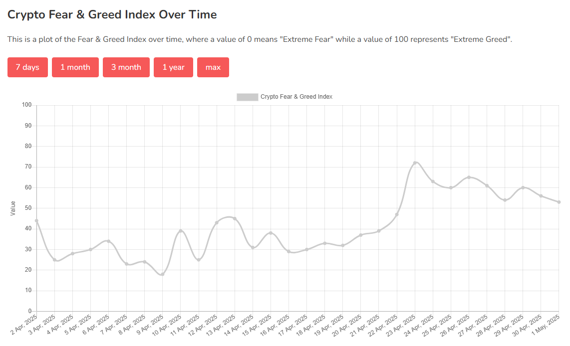 암호화폐 데이터 제공 업체 알티너티브(Alternative)에 따르면, 공포·탐욕 지수는 전날보다 3포인트 하락하며 53을 기록했다. 이 지수는 0에 가까울수록 투자자들이 극단적인 공포를 느끼고 있으며, 100에 가까울수록 시장이 과열되었음을 나타낸다.