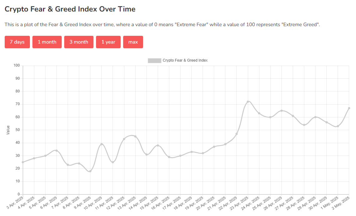 암호화폐 시장의 투자 심리가 회복되며 ‘공포·탐욕 지수’가 67까지 상승했다.