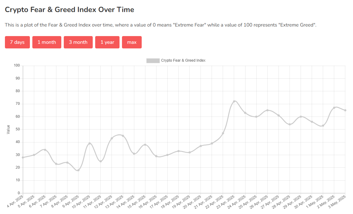 암호화폐 시장의 투자 심리가 비슷한 수준을 유지하며 ‘공포·탐욕 지수’가 65를 기록했다.