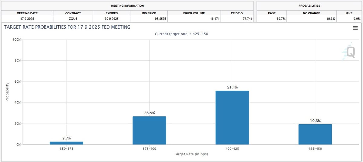 시카고상품거래소(CME) 페드워치에 따르면 트레이더들은 연준이 오는 9월 금리가 인하될 확률을 80% 이상으로 예상하고 있다.