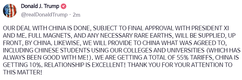 트럼프는 이번 합의에 따라 중국이 희토류 및 자석을 전량 선납 형태로 공급하고, 미국은 중국 유학생 수용 등을 포함한 약속을 이행할 것이라고 설명했다. 또한 “미국은 총 55%의 관세를 받고 있지만, 중국이 미국산 제품에 부과하는 관세는 10% 수준”이라며 불균형을 강조했다.