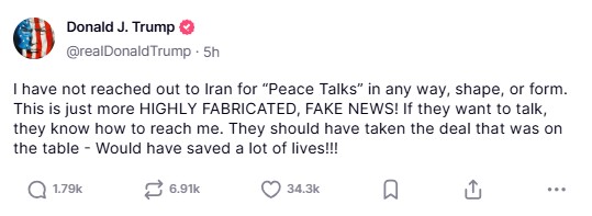 도널드 트럼프 미국 대통령이 최근 제기된 이란과의 평화 협상설을 강하게 부인했다. 그는 17일(현지시간) 자신의 SNS 플랫폼인 트루스소셜에 "이란과 어떤 형태로든 '평화 협상'을 위해 접촉한 적이 없다. 전부 조작된 가짜 뉴스일 뿐"이라고 밝혔다.