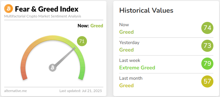 암호화폐 시장의 낙관 심리가 여전히 강한 흐름을 이어가고 있다. 암호화폐 데이터 제공업체 알터너티브(Alternative)에 따르면, 7월 21일 기준 '공포·탐욕 지수'는 전날보다 1포인트 하락한 71을 기록했다. 수치는 소폭 낮아졌지만, 여전히 ‘탐욕(Greed)’ 구간에 머무르고 있다.